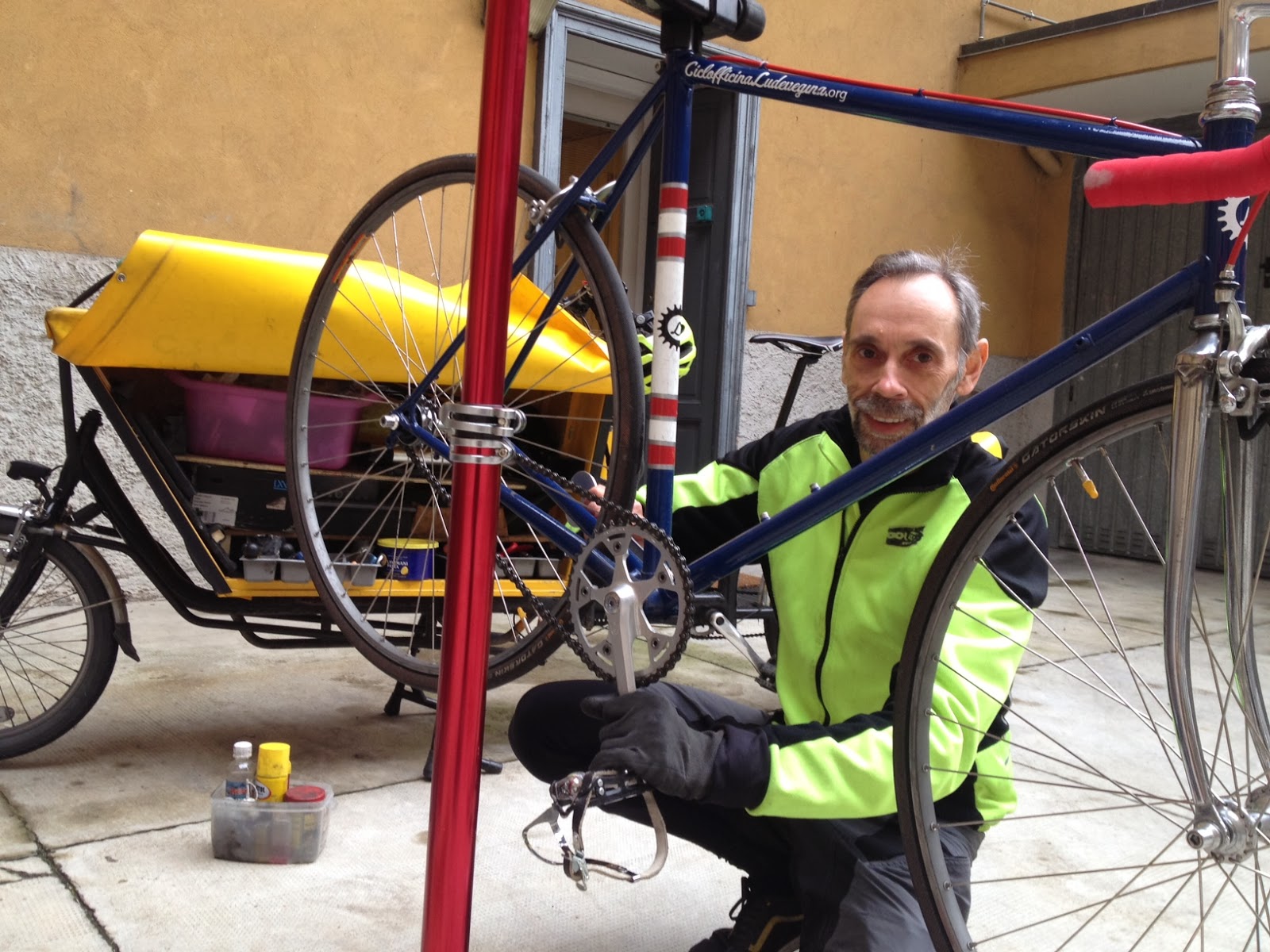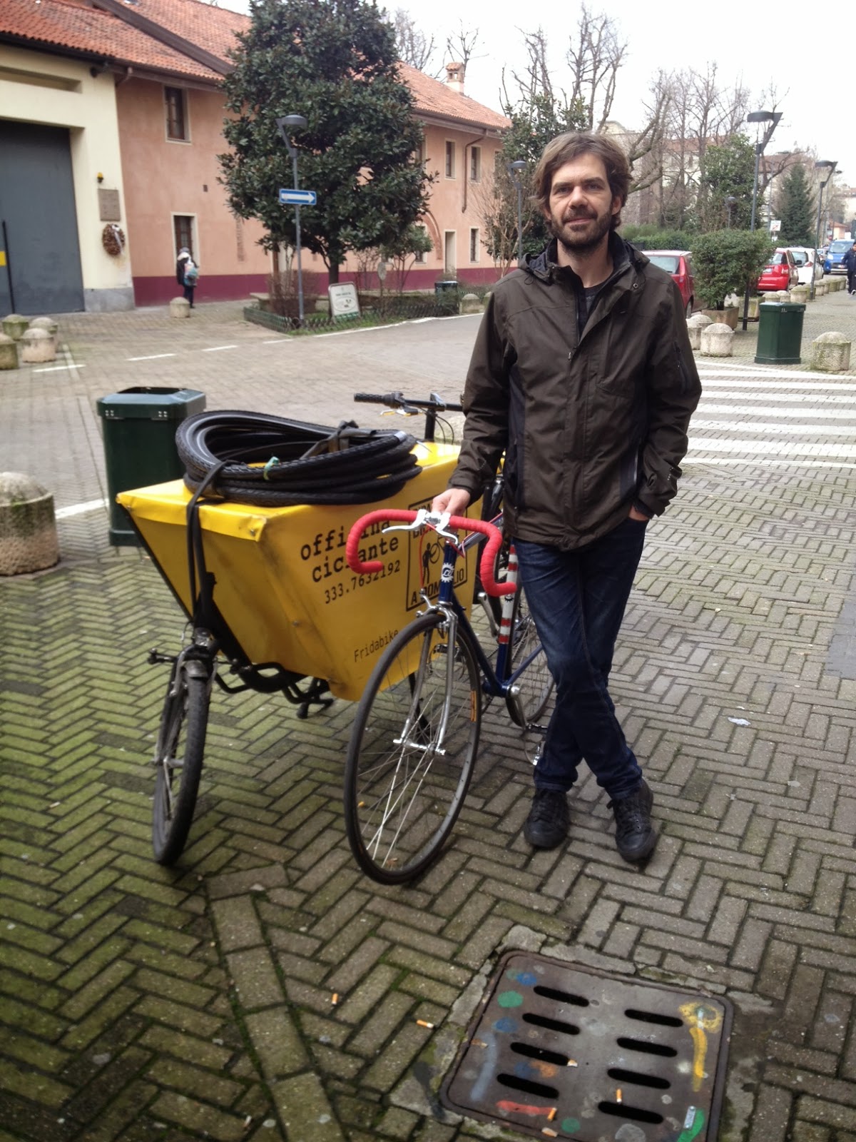 Paolo ha una bella bicicletta da corsa degli anni '70 convertita in single-speed. Telaio leggerissimo con forcella cromata, monta un gruppo Campagnolo Record. Il tutto confezionato meticolosamente da Morgan. Paolo ha montato dei tubolari e ora ha un bel mezzo per muoversi velocemente da una parte all'altra della città. Mi ha chiamato per un piccolo intervento e mentre ero all'opera si è divertito a scattare un paio di foto. Nel frattempo abbiamo fatto due chiacchiere; Paolo si occupa tra le altre cose anche di edilizia sostenibile in legno ma è decisamente un personaggio pieno di risorse. Ha due gemelli e spera di poterli portare in giro quanto prima su una bella cargo-bike.